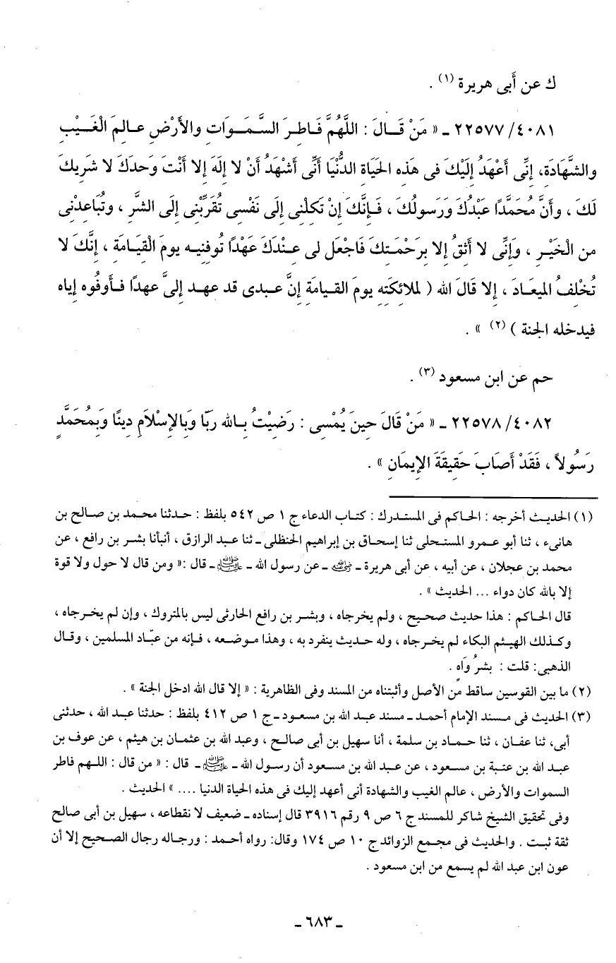 (¬3) الحديث في مسند الإِمام أحمد -مسند عبد الله بن مسعود- ج 1 ص 412 بلفظ: حدثنا عبد الله، حدثني أبي، ثنا عفان، ثنا حماد بن سلمة، أنا سهيل بن أبي صالح، وعبد الله بن عثمان بن هيثم، عن عوف بن عبد الله بن عتبة بن مسعود، عن عبد الله بن مسعود أن رسول الله - صلى الله عليه وسلم - قال: "من قال: اللهم فاطر السموات والأرض، عالم الغيب والشهادة أني أعهد إليك في هذه الحياة الدنيا .... " الحديث.