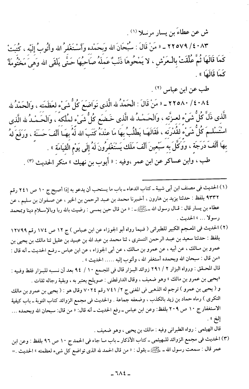 (¬2) الحديث في المعجم الكبير للطبراني (فيما رواه أبو الجوزاء عن ابن عباس) ج 12 ص 174 رقم 12799 بلفظ: حدثنا سعيد بن عبد الرحمن التستري، ثنا محمَّد بن عبد الله بن عبيد بن عقيل ثنا مالك بن يحيى بن عمرو بن مالك، عن أبيه، عن عمرو بن مالك، عن أبي الجوزاء، عن ابن عباس -رفع الحديث- أنه قال: "من قال: سبحان الله وبحمده أستغفر الله، وأتوب إليه. . الحديث".