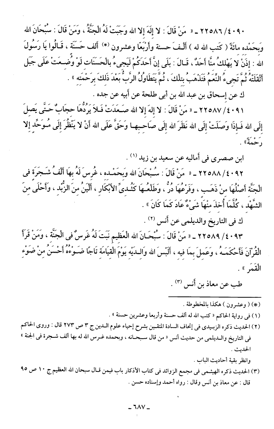 4092/ 22588 - "مَنْ قَال: سُبْحَانَ الله وَبِحَمْدِهِ، غُرِسَ لَهُ بِهَا أَلفُ شَجَرَة في الْجَنَّةِ أَصْلُهَا مِنْ ذَهَبِ، وَفَرْعُهَا دُرُّ، وَطَلعُهَا كثُدِيِّ الأَبْكَارِ، أَلينُ مِنَ الزُّبْدِ، وَأَحْلَى مِنَ الشَّهْدِ، كُلَّمَا أُخِذَ مِنْهَا شَيْءٌ عَادَ كَمَا كَانَ".
