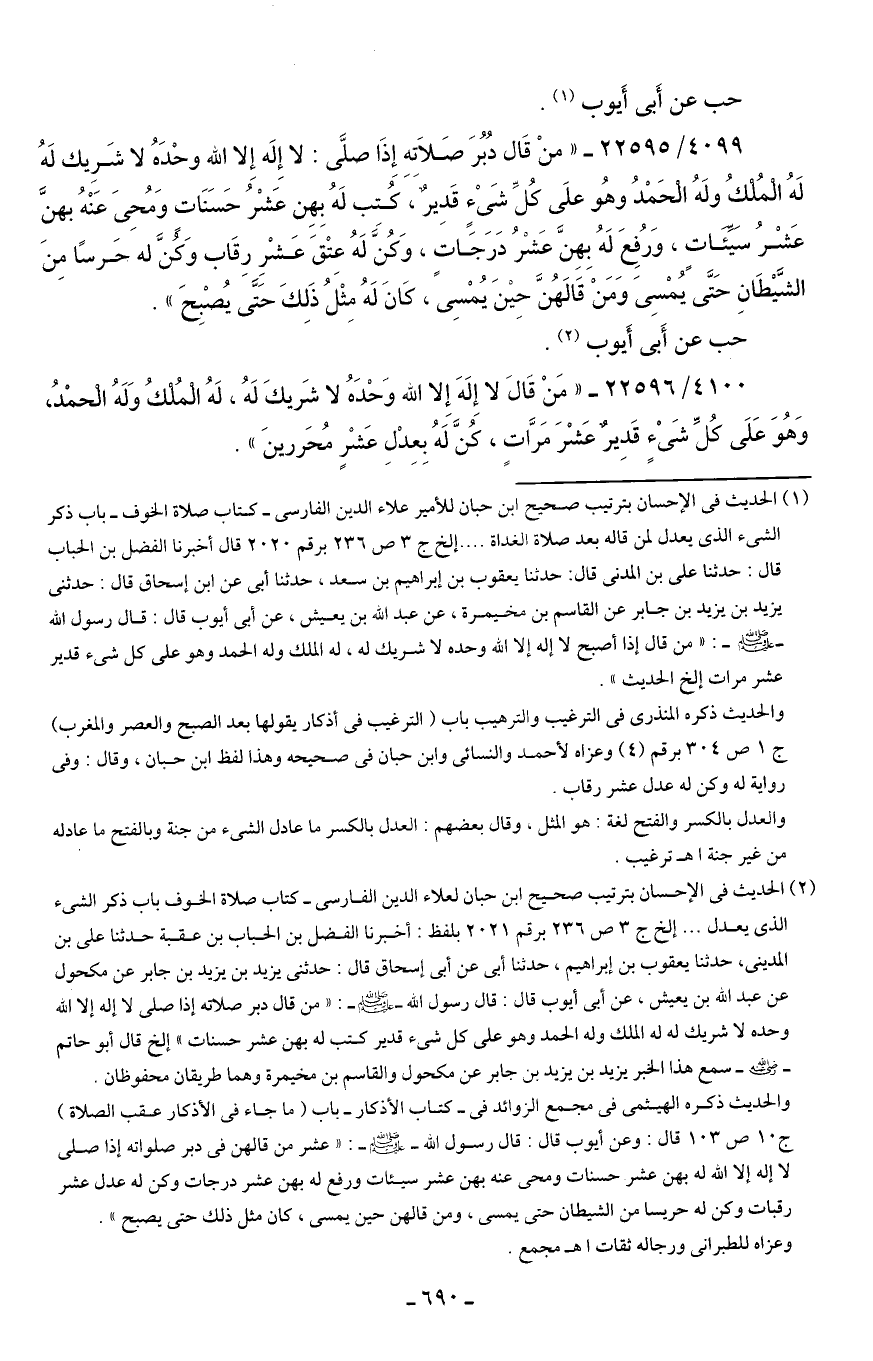 4100/ 22596 - "مَنْ قَال لا إِلَهَ إِلا الله وَحْدَهُ لا شَريكَ لَهُ، لَهُ الْمُلكُ وَلَهُ الحمْدُ، وَهُوَ عَلَى كل شَيءٍ قَدِيرٌ عَشْرَ مَرَّاتٍ، كُنَّ لَهُ بِعِدْلِ عَشْرٍ مُحَررينَ".