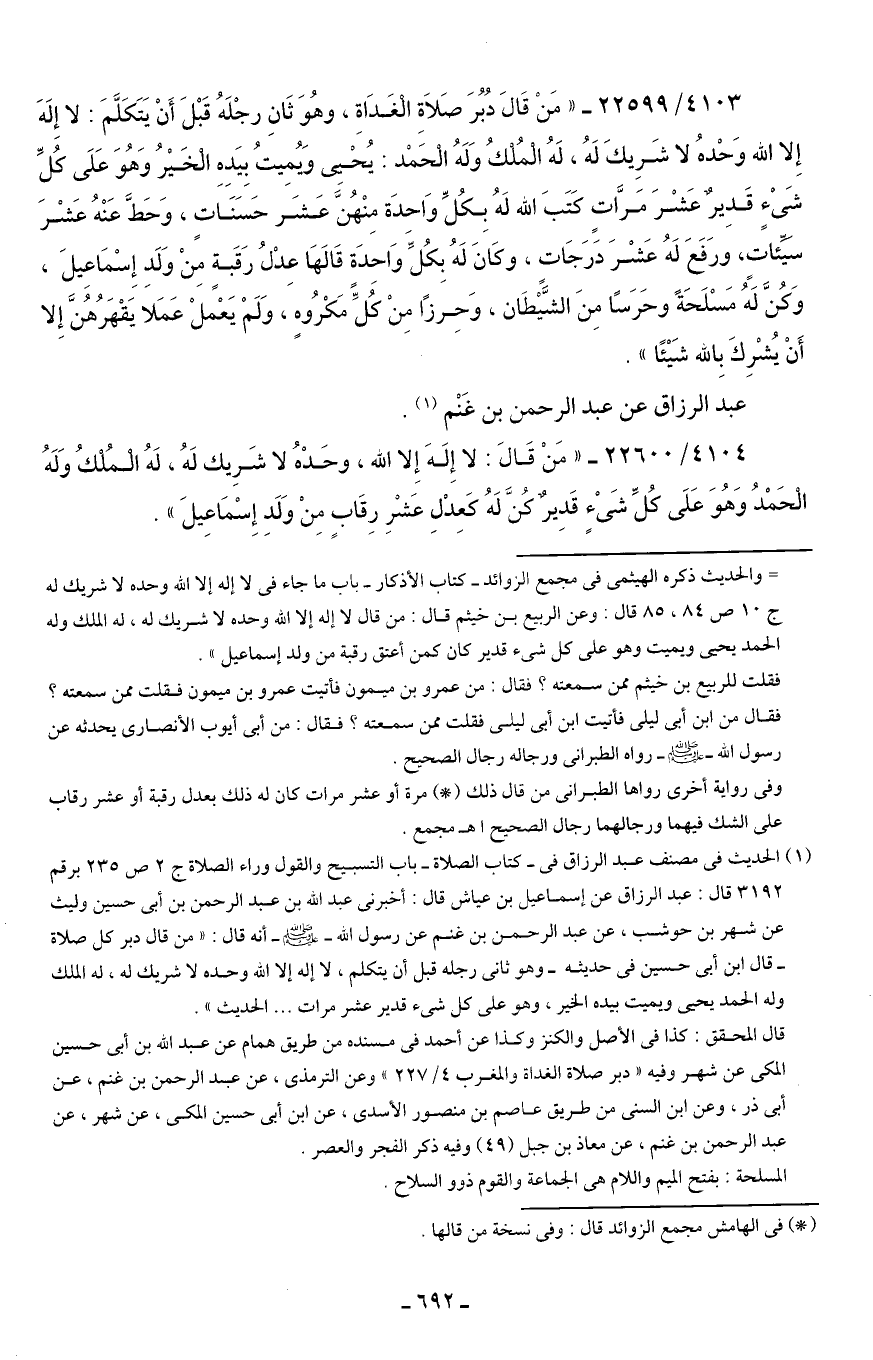 (¬1) الحديث في مصنف عبد الرزاق في -كتاب الصلاة -باب التسبيح والقول وراء الصلاة ج 2 ص 235 برقم 3192 قال: عبد الرزاق عن إسماعيل بن عياش قال: أخبرني عبد الله بن عبد الرحمن بن أبي حسين وليث عن شهر بن حوشب، عن عبد الرحمن بن غنم عن رسول الله - صلى الله عليه وسلم - أنه قال: "من قال دبر كل صلاة -قال ابن أبي حسين في حديثه- وهو ثاني رجله قبل أن يتكلم، لا إله إلا الله وحده لا شريك له، له الملك وله الحمد يحيي ويميت يده الخير، وهو على كل شيء قدير عشر مرات ... الحديث".