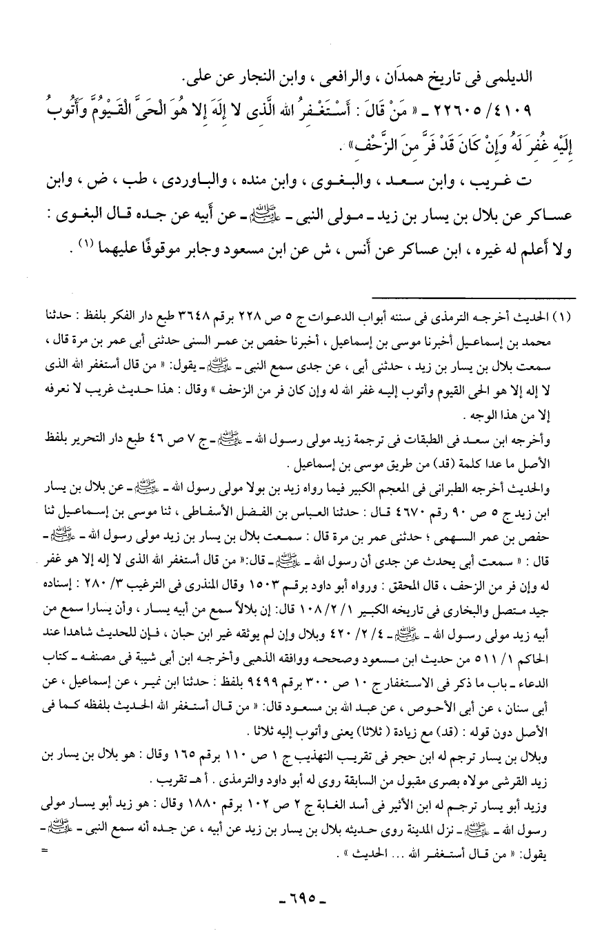 (¬1) الحديث أخرجه الترمذي في سننه أبواب الدعوات ج 5 ص 228 برقم 3648 طبع دار الفكر بلفظ: حدثنا محمَّد بن إسماعيل أخبرنا موسى بن إسماعيل، أخبرنا حفص بن عمر السني حدثني أبي عمر بن مرة قال، سمعت بلال بن يسار بن زيد، حدثني أبي، عن جدي سمع النبي - صلى الله عليه وسلم - يقول: "من قال أستغفر الله الذي لا إله إلا هو الحي القيوم وأتوب إليه غفر الله له وإن كان فر من الزحف" وقال: هذا حديث غريب لا نعرفه إلا من هذا الوجه.