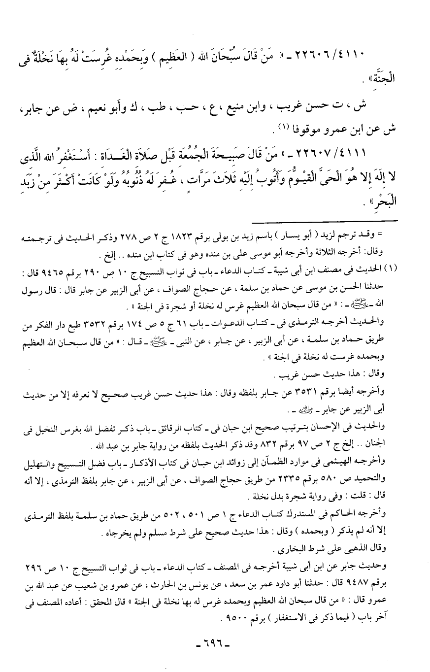 4110/ 22606 - "مَنْ قَال سُبْحَانَ الله (العَظِيم) وَبِحَمْدِهِ غُرِسَتْ لَهُ بِهَا نَخْلَةٌ في الْجَنَّةِ".