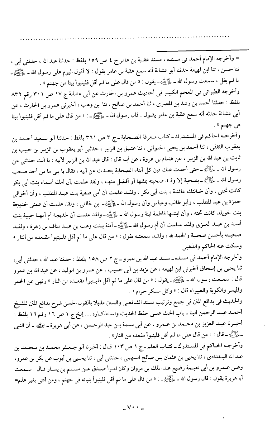 = وأخرجه الإِمام أحمد في مسنده" مسند عقبة بن عامر ج 4 ص 159 بلفظ: حدثنا عبد الله، حدثني أبي، ثنا حسن، ثنا ابن لهيعة حدثنا أبو عشانة أنه سمع عقبة بن عامر يقول: لا أقول اليوم على رسول الله - صلى الله عليه وسلم - ما لم يقل، سمعت رسول الله - صلى الله عليه وسلم - يقول: "من قال علي ما لم أقلّ فليتبوأ بيتا في جهنم".