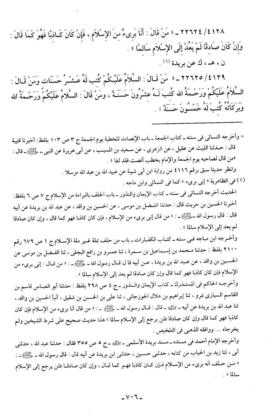 4128/ 22624 - "مَنْ قَال: أَنَا بَرِيءٌ مِنَ الإِسْلامِ، فَإنْ كَانَ كَاذبًا فَهُوَ كَمَا قَال: وَإِنْ كَانَ صَادِقًا لَمْ يَعُدْ إِلَى الإِسْلامِ سَالِمًا".