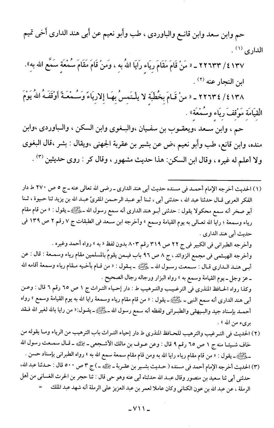 (¬1) الحديث أخرجه الإمام أحمد في مسنده حديث أبي هند الداري - رضي الله تعالى عنه- ج 5 ص 270 ط دار الفكر العربي قال حدثنا عبد الله، حدثني أبي، ثنا أبو عبد الرحمن المقرئ عبد الله بن يزيد ثنا حيوة، ثنا أبو صخر أنه سمع محكولا يقول: حدثني أبو هند الدارمي أنه سمع رسول الله - صلى الله عليه وسلم - يقول: "من قام مقام رياء وسمعة؛ رايا الله تعالى به يوم القيامة وسمع" وأخرجه ابن سعد في الطبقات ج 7 رقم 2 ص 139 في حديث أبي هند الداري.