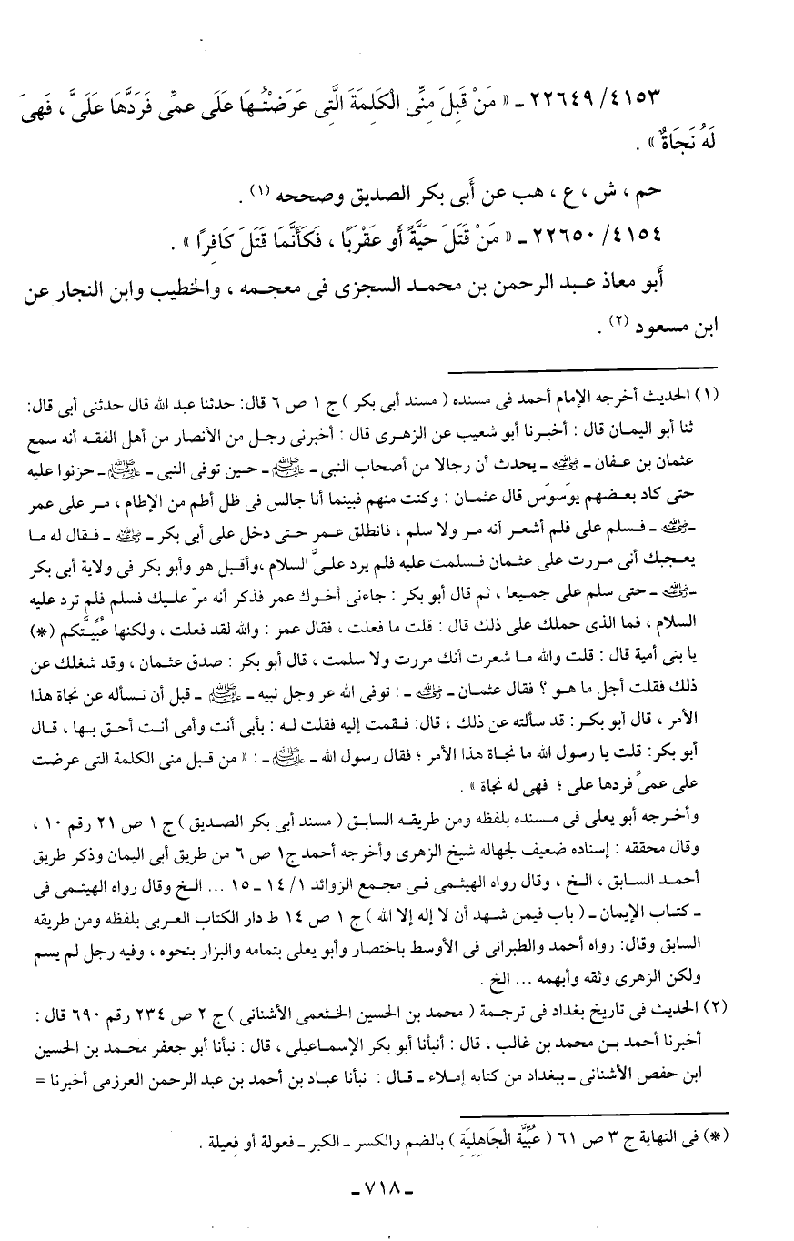 (¬1) الحديث أخرجه الإمام أحمد في مسنده (مسند أبي بكر) ج 1 ص 6 قال: حدثنا عبد الله قال حدثني أبي قال: ثنا أبو اليمان قال: أخبرنا أبو شعيب عن الزهري قال: أخبرني رجل من الأنصار من أهل الفقه أنه سمع عثمان بن عفان - رضي الله عنه - يحدث أن رجالا من أصحاب النبي - صلى الله عليه وسلم - حين توفى النبي - صلى الله عليه وسلم - حزنوا عليه حتى كاد بعضهم يوَسوَس قال عثمان: وكنت منهم فبينما أنا جالس في ظل أطم من الإطام، مر على عمر - رضي الله عنه - فسلم على فلم أشعر أنه مر ولا سلم، فانطلق عمر حتى دخل على أبي بكر - رضي الله عنه - فقال له ما يعجبك أنى مررت على عثمان فسلمت عليه فلم يرد عليَّ السلام، وأقبل هو وأبو بكر في ولاية أبي بكر - رضي الله عنه - حتى سلم على جميعا، ثم قال أبو بكر: جاءنى أخوك عمر فذكر أنه مرّ عليك فسلم فلم ترد عليه السلام، فما الذي حملك على ذلك قال: قلت ما فعلت، فقال عمر: والله لقد فعلت، ولكنها عُبِّيَّتكم (*) يا بني أمية قال: قلت والله ما شعرت أنك مررت ولا سلمت، قال أبو بكر: صدق عثمان، وقد شغلك عن ذلك فقلت أجل ما هو؟ فقال عثمان - رضي الله عنه -: توفى الله عز وجل نبيه - صلى الله عليه وسلم - قبل أن نسأله عن نجاة هذا الأمر، قال أبو بكر: قد سألته عن ذلك، قال: فقمت إليه فقلت له: بأبي أنت وأمى أنت أحق بها، قال أبو بكر: قلت يا رسول الله ما نجاة هذا الأمر، فقال رسول الله - صلى الله عليه وسلم -: "من قبل منى الكلمة التي عرضت على عميِّ فردها على؛ فهي له نجاة".