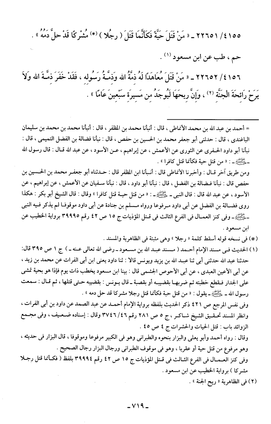 4156/ 22652 - "مَنْ قَتَلَ مُعَاهَدًا لَهُ ذِمَّةُ الله وَذِمَّةُ رَسُولِهِ، فَقَدْ خَفَرَ ذِمَّةَ الله وَلَا يَرَحْ رَائِحَةَ الْجَنَّةِ (¬2)، وَإنَّ رِيحَهَا لَيُوجَدُ مِن مَسِيرَةِ سَبْعِينَ عَامًا".