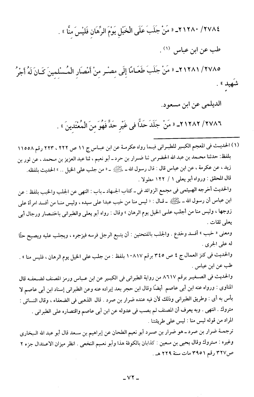 2784/ 21280 - "مَنْ جَلَبَ عَلَى الْخَيلِ يَوْمَ الرِّهَانِ فَليسَ مِنَّا".