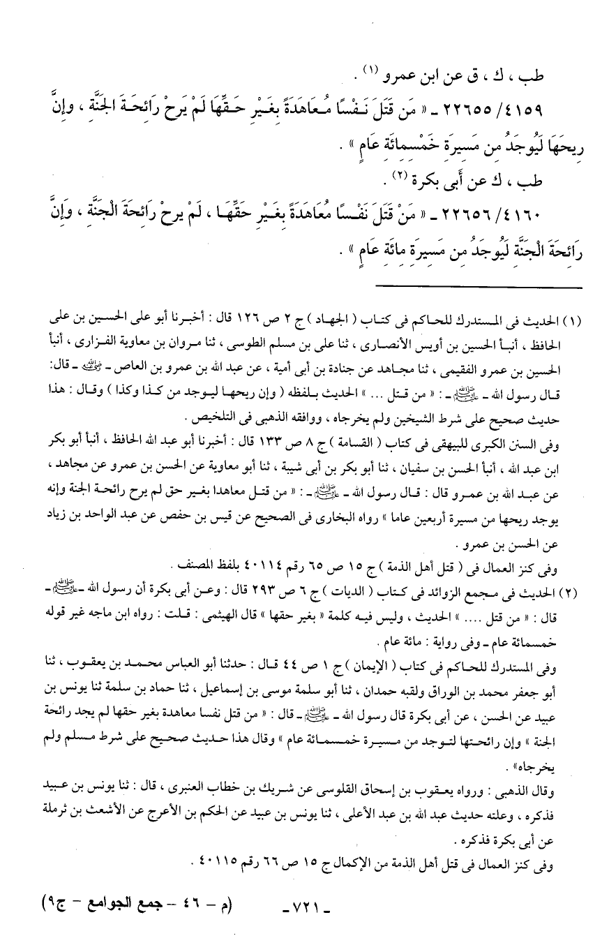 4159/ 22655 - "مَن قَتَلَ نَفْسًا مُعَاهَدَةً بِغَيرِ حَقِّهَا لَمْ يَرحْ رَائِحَةَ الجَنَّةِ، وإِنَّ رِيحَهَا لَيُوجَدُ مِن مَسِيرَةِ خَمْسِمِائَةِ عَامٍ".