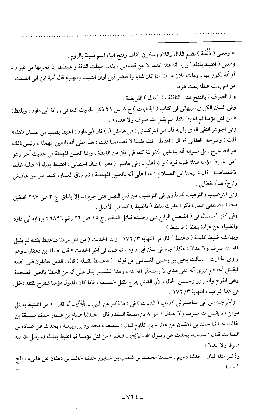 وفي كنز العمال في (الفصل الرابع في وعيدة قاتل النفس ج 15 ص 22 رقم 39896 برواية أبي داود والضياء عن عادة بلفظ (فاعتبط).