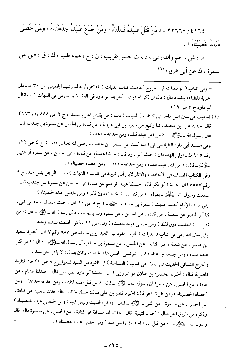 4164/ 22660 - "مَنْ قَتَلَ عَبْدهُ قَتَلْنَاهُ، ومَنْ جَدَعَ عَبْدَهُ جدَعْنَاهُ، ومَنْ خَصَى عَبْدهُ خَصَينَاهُ".