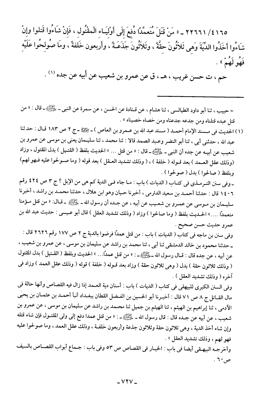 4165/ 22661 - "مَنْ قَتَلَ مُتَعمِّدًا دُفِعَ إِلَى أَوْلِيَاءِ الْمقْتُولِ، فَإِنْ شَاءُوا قَتلوا وإِنْ شَاءُوا أَخَذُوا الدِّيَةَ وَهِي ثَلاثُونَ حِقَّةً، وثَلاثُونَ جَذَعَةً، وأَربعون خَلفةً، ومَا صُولِحُوا عَلَيهِ فَهُو لَهُمْ".