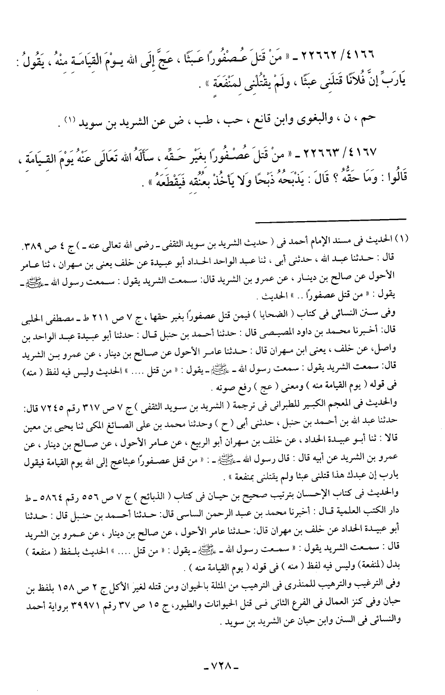 4167/ 22663 - "منْ قَتلَ عُصْفُورًا بِغَير حَقِّهِ، سَأَلَهُ الله تَعَالى عَنْهُ يَوْمَ القِيَامَةِ، قَالُوا: وَمَا حَقُّهُ؟ قَال: يَذْبَحُهُ ذَبْحًا وَلا يَأخُذْ بعُنُقِهِ فَيَقْطَعَهُ".