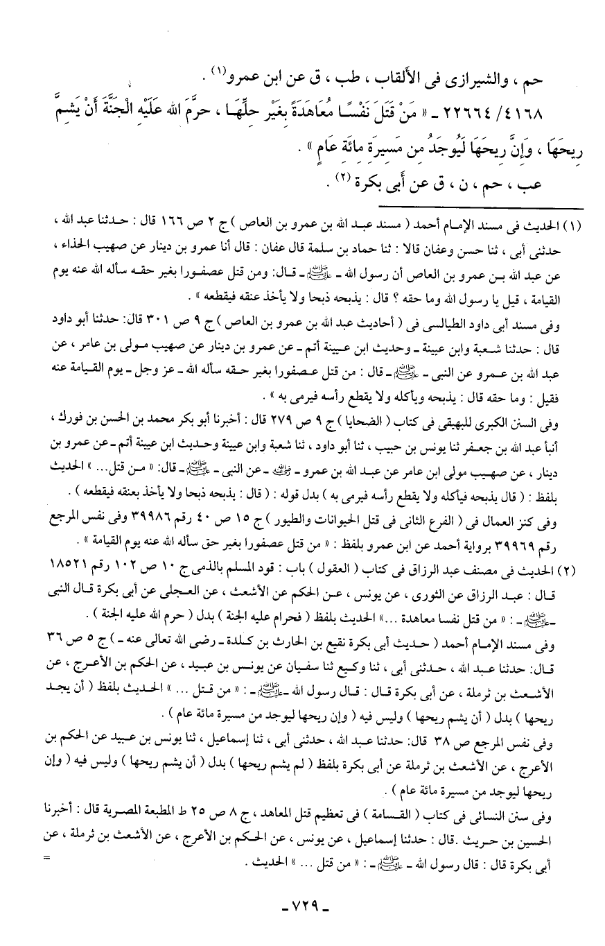 وفي سنن النسائي في كتاب (القسامة) في تعظيم قتل المعاهد، ج 8 ص 25 ط الطبعة المصرية قال: أخبرنا الحسين بن حريث. قال: حدثنا إسماعيل، عن يونس، عن الحكم بن الأعرج، عن الأشعت بن ثرملة، عن أبي بكرة قال: قال رسول الله - صلى الله عليه وسلم -: "من قتل ... " الحديث. =