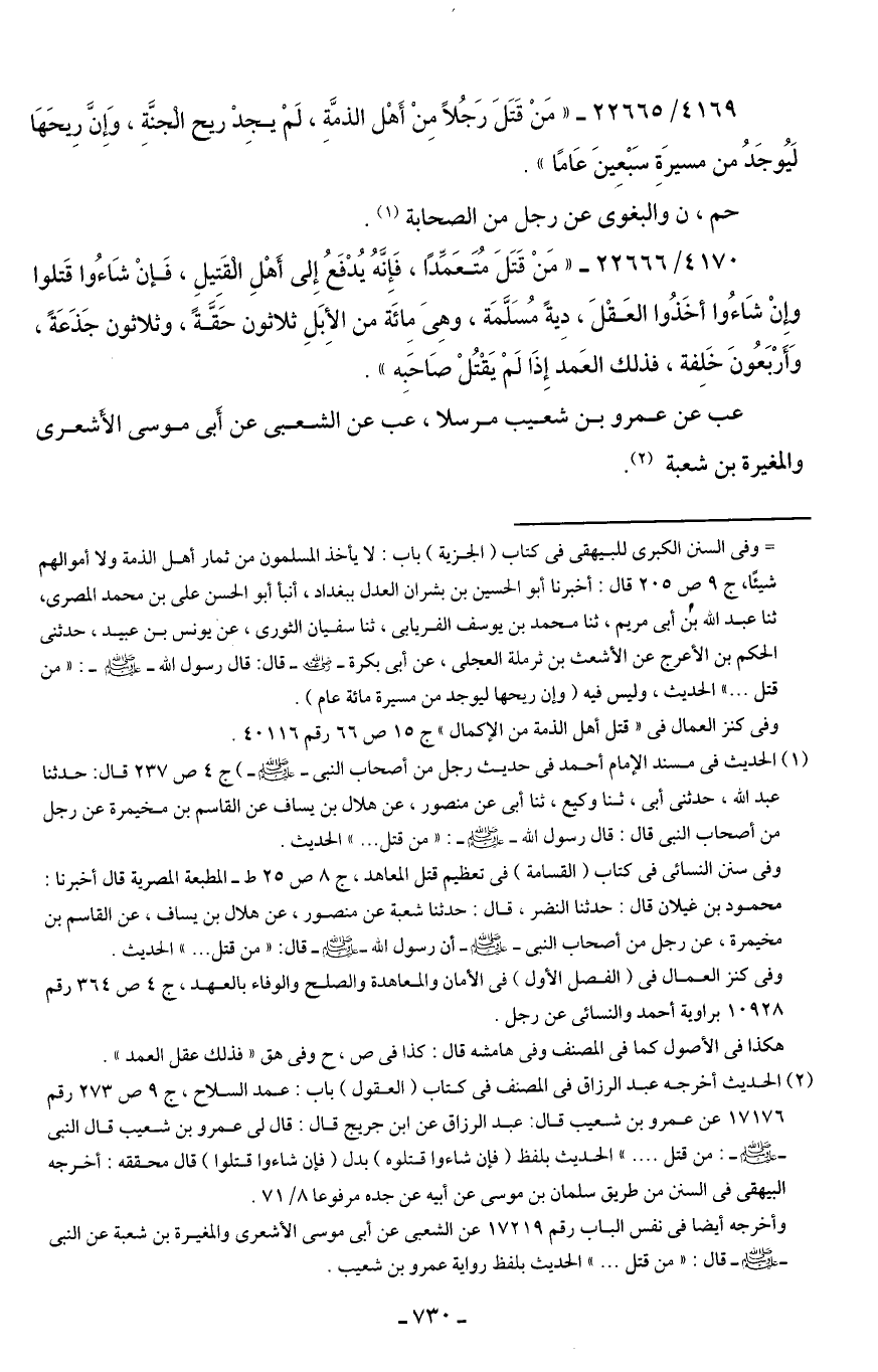 4169/ 22665 - "مَنْ قَتَلَ رَجُلًا مِنْ أَهْل الذمَّة، لَمْ يجِدْ ريح الْجنَّةِ، وَإِنَّ رِيحَهَا لَيُوجَدُ من مسيرَةِ سَبْعِينَ عَامًا".