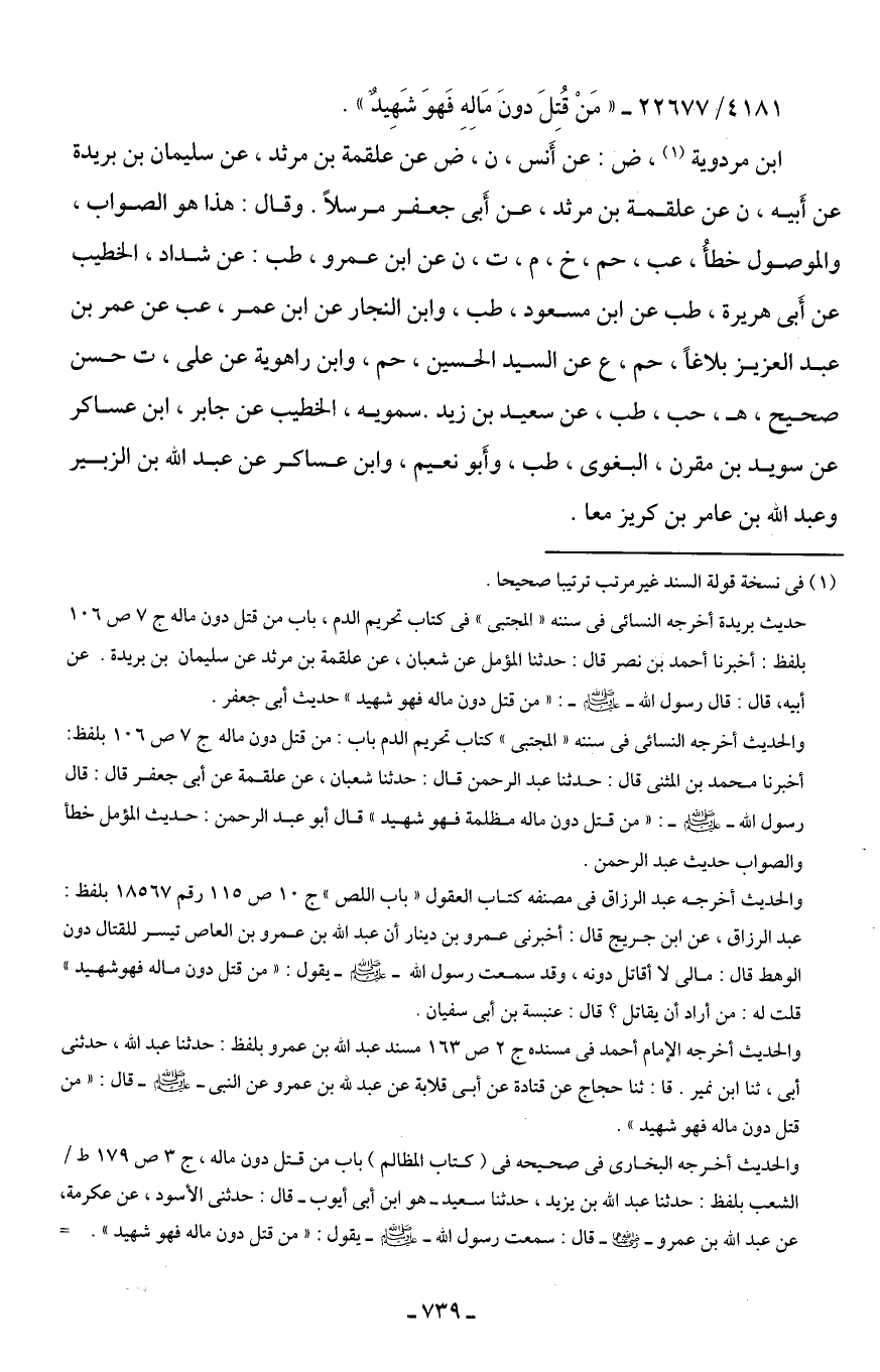 4181/ 22677 - "مَنْ قُتِلَ دونَ مَالِهِ فَهوَ شَهِيدٌ".