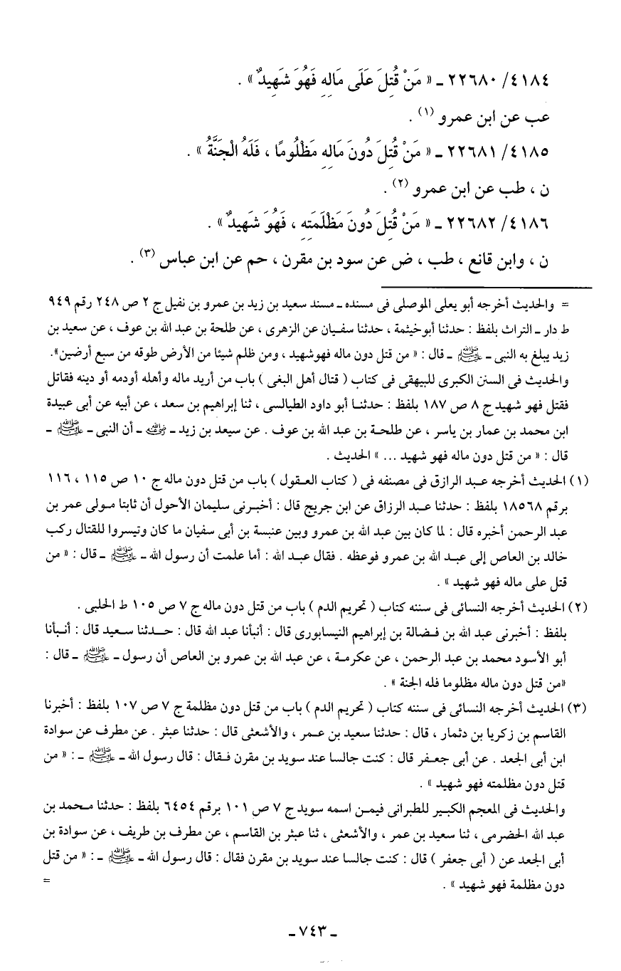 4184/ 22680 - "مَنْ قُتِلَ عَلَى مَالِهِ فَهُوَ شَهِيدٌ".