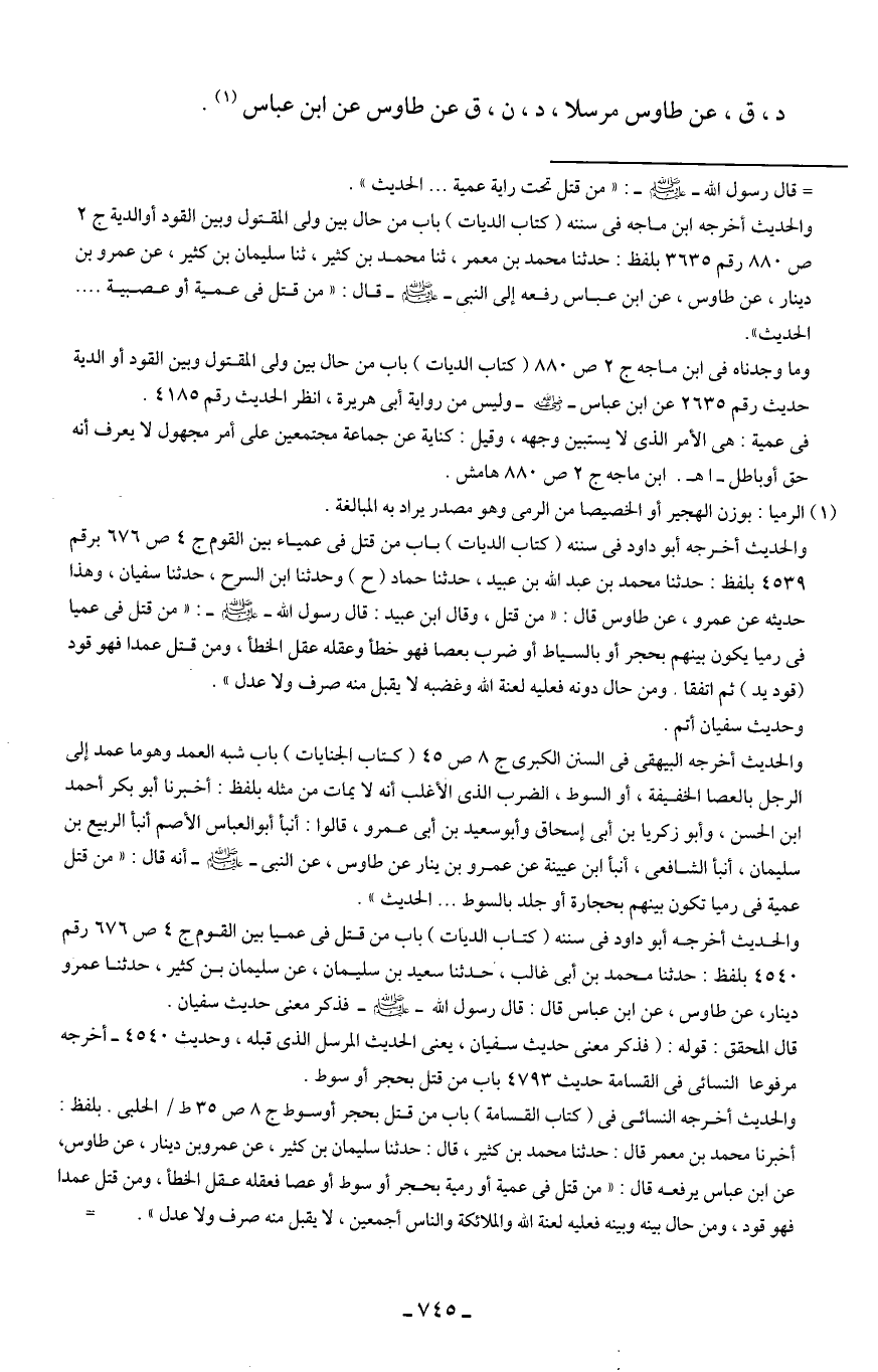والحديث أخرجه أبو داود في سننه (كتاب الديات) باب من قتل في عمياء بين القوم ج 4 ص 676 برقم 4539 بلفظ: حدثنا محمد بن عبد الله بن عبيد، حدثنا حماد (ح) وحدثنا ابن السرح، حدثنا سفيان، وهذا حديثه عن عمرو، عن طاوس قال: "من قتل، وقال ابن عبيد: قال رسول الله - صلى الله عليه وسلم -: "من قتل في عميا في رميا يكون بينهم بحجر أو بالسياط أو ضرب بعصا فهو خطأ وعقله عقل الخطأ، ومن قتل عمدا فهو قود (قود يد) ثم اتفقا. ومن حال دونه فعليه لعنة الله وغضبه لا يقبل منه صرف ولا عدل".