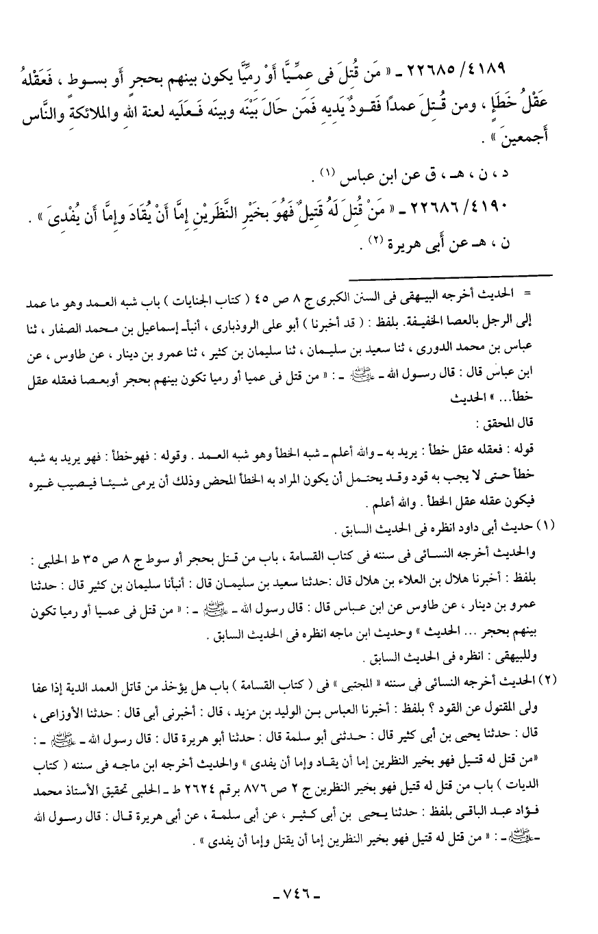 4189/ 22685 - "مَن قُتِلَ في عِمِّيَّا أَوْ رِمِّيَّا يكون بينهم بحجرٍ أَو بسوطٍ، فَعَقْلهُ عَقْلُ خَطَإٍ، ومن قُتِلَ عمدًا فَقودٌ يَديه فَمَن حَال بَينَه وبينَه فَعَلَيه لعنة الله والملائكةَ والنَّاس أَجمعينَ".