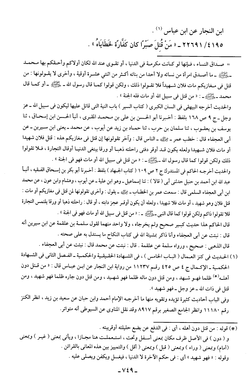 (¬1) الحديث في كنز العمال (الباب الخامس)، في الشهادة الحقيقية والحكمية- الفصل الثاني في الشهادة الحكمية- الإكمال ج 4 ص 425 رقم 11237 من رواية ابن النجار عن ابن عباس قال: "من قتل دون أهله (*) ظلما فهو شهيد، ومن قتل دون ماله ظلما فهو شهيد، ومن قتل دون جاره ظلما فهو شهيد، ومن قتل في ذات الله -عزَّ وجلَّ- فهو شهيد".