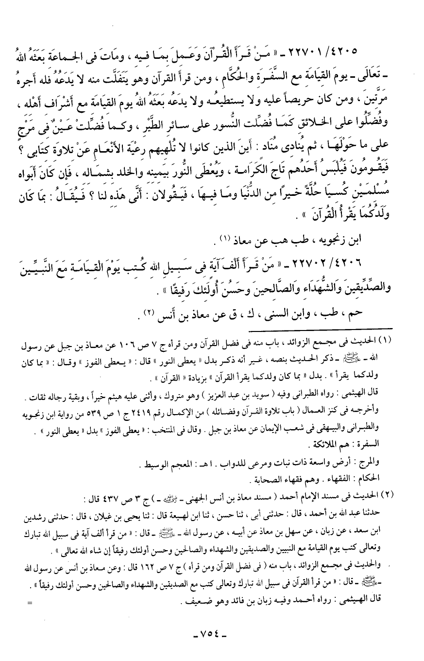 4206/ 22702 - "مَنْ قَرَأَ أَلْفَ آيَةٍ في سَبِيلِ اللهِ كُتِب يَوْمَ الْقِيَامَةِ مَعَ النَّبيِّينَ والصِّدِّيقِينَ وَالشُّهَدَاءِ وَالصَّالِحينَ وحَسُنَ أُوَلَئِكَ رَفِيقًا".