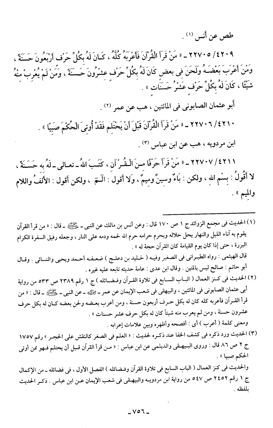 4209/ 22705 - "مَنْ قَرَأَ الْقُرآنَ فَأَعْرَبَهُ كُلَّهُ، كَانَ لَهُ بِكُلِّ حَرْفٍ أَرْبَعُونَ حَسَنَةً، وَمْنَ أَعْرَبَ بَعْضَهُ وَلَحَنَ في بعضٍ كَانَ لَهُ بِكُلِّ حَرْفٍ عِشْرُونَ حَسَنَةً، وَمَنْ لَمْ يُعْرِبْ منْهُ شَيئًا، كَانَ لَهُ بِكُلِّ حَرْفٍ عَشْرُ حَسَنَاتٍ".