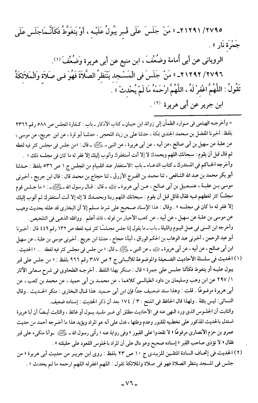 2795/ 21291 - "مَنْ جَلَسَ عَلَى قْبرٍ يَبُولُ عَلَيهِ، أَوْ يَتغَوَّطُ فَكَأَنَّمَا جَلَس عَلَى جَمْرَةِ نَار".
