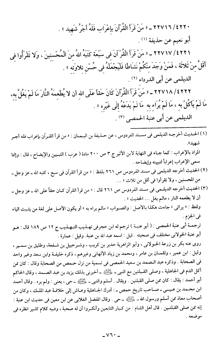 4220/ 22716 - "مَنْ قَرَأَ الْقُرآنَ بإعْرَاب فَلَهُ أَجْرُ شَهِيد".