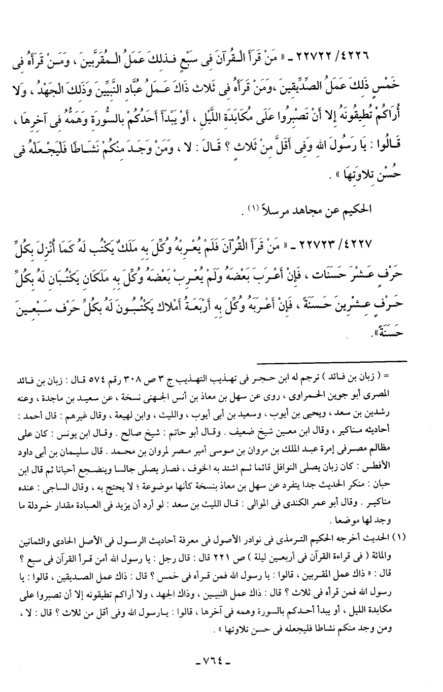 4226/ 22722 - "مَنْ قَرَأَ الْقُرآنَ في سَبع فذلِكَ عَمَلُ المُقَرَّبينَ، وَمَنْ قَرَأَهُ في خَمْسٍ ذَلِكَ عَمَلُ الصِّدِّيقِينَ، وَمَنْ قَرَأَهُ في ثَلاث ذَاكَ عَمَلُ عُبَّادِ النَّبِيِّينَ وَذَلِكَ الْجَهْدُ، وَلا أُرَاكُمْ تُطِيقُونَهُ إِلا أَنْ تَصْبِرُوا عَلَى مُكَابَدَةِ اللَّيلِ، أَوْ يَبْدَأَ أَحَدُكُمْ بالسُّورَةِ وَهَمُّهُ في آخِرِهَا، قَالُوا: يَا رَسُولَ اللهِ وَفِي أَقَلَّ مِن ثَلاثٍ؟ قَال. لا، وَمَنْ وَجَدَ مِنْكُمْ نَشَاطًا فَليَجْعَلهُ في حُسْن تِلاوَتِهَا".