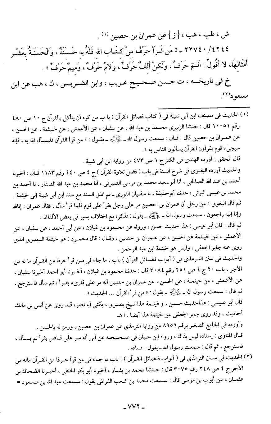 4244/ 22740 - "مَنْ قَرَأَ حَرْفًا مِنْ كِتَاب اللهِ فَلَهُ بهِ حَسَنَة، وَالْحَسَنَةُ بِعَشْر أَمْثَالِهَا، لا أَقُولُ: الم حَرْفٌ، وَلَكِنْ أَلِفٌ حَرْفٌ، وَلامٌ حَرْفٌ، وَمِيمٌ حَرْفٌ".