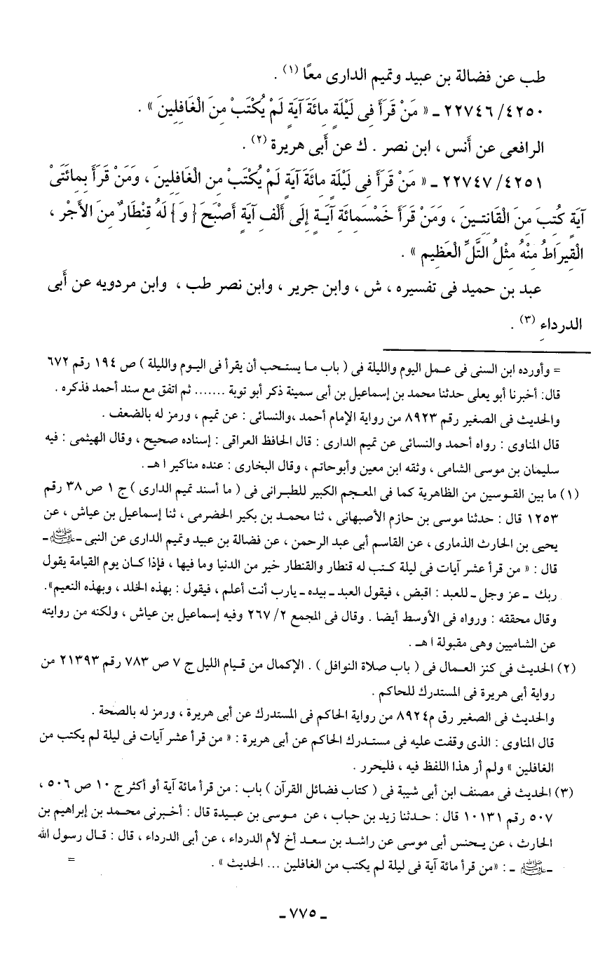 4250/ 22746 - "مَنْ قَرَأَ فِي لَيلَةٍ مِائَةَ آيَةٍ لَمْ يُكْتَبْ مِنَ الْغَافِلِينَ".