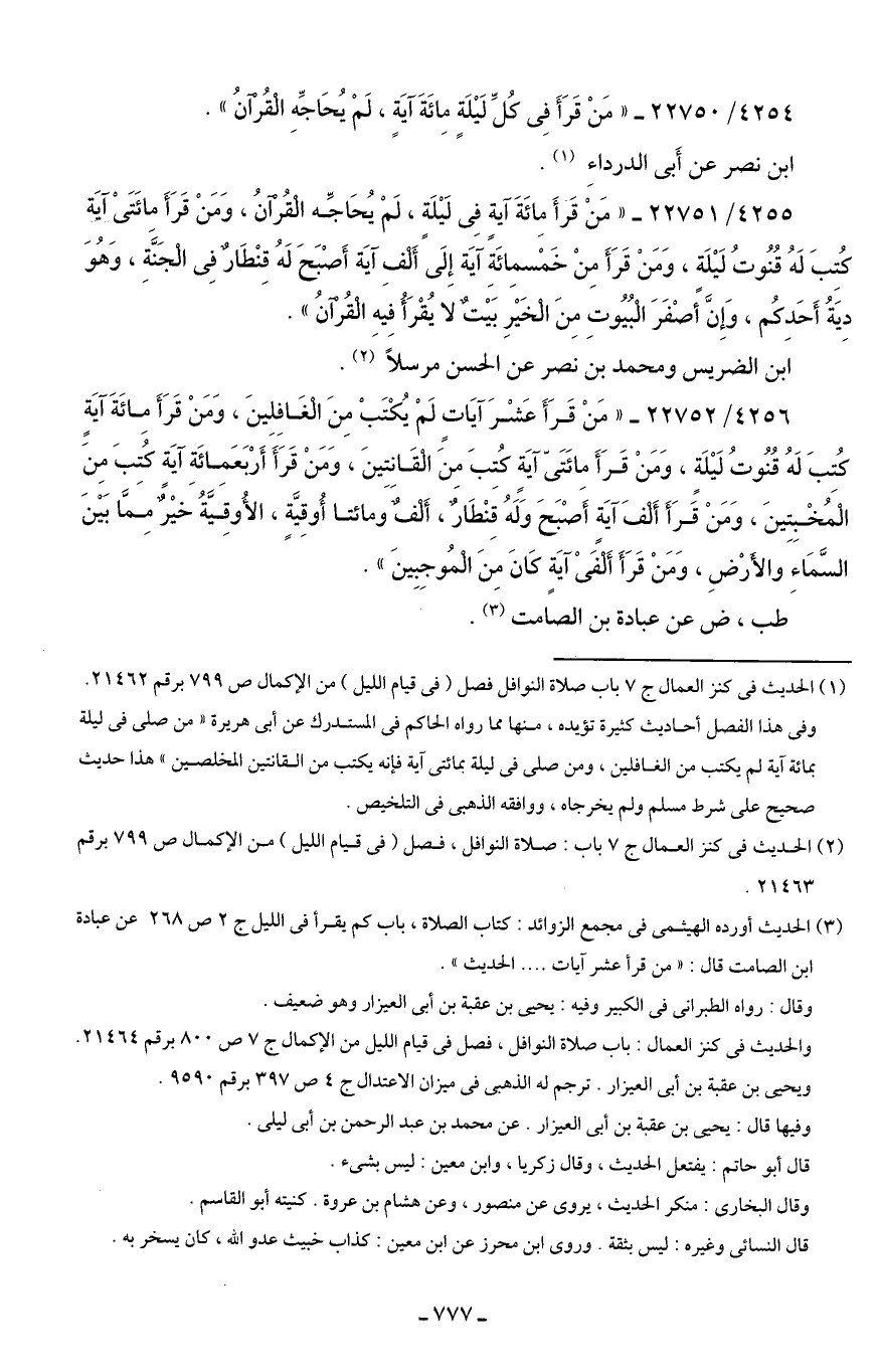 4254/ 22750 - "مَنْ قَرَأَ فِي كُلِّ لَيلَةٍ مِائَةَ آيَةٍ، لَمْ يُحَاجِّهِ الْقُرآنُ".