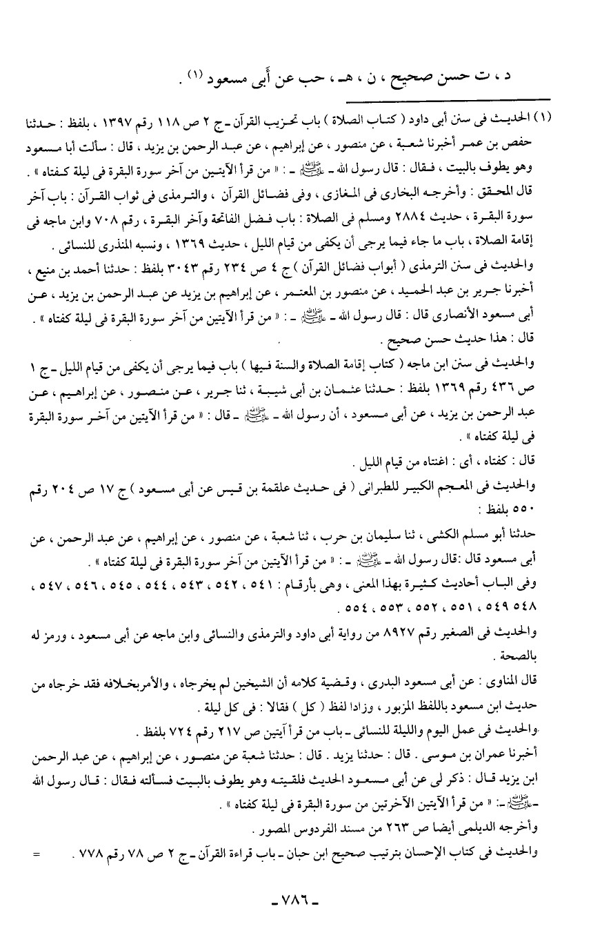 (¬1) الحديث في سنن أبي داود (كتاب الصلاة) باب تحزيب القرآن- ج 2 ص 118 رقم 1397، بلفظ: حدثنا حفص بن عمر أخبرنا شعبة، عن منصور، عن إبراهيم، عن عبد الرحمن بن يزيد، قال: سألت أبا مسعود وهو يطوف بالبيت، فقال: قال رسول الله - صلى الله عليه وسلم -: "من قرأ الآيتين من آخر سورة البقرة في ليلة كفتاه".