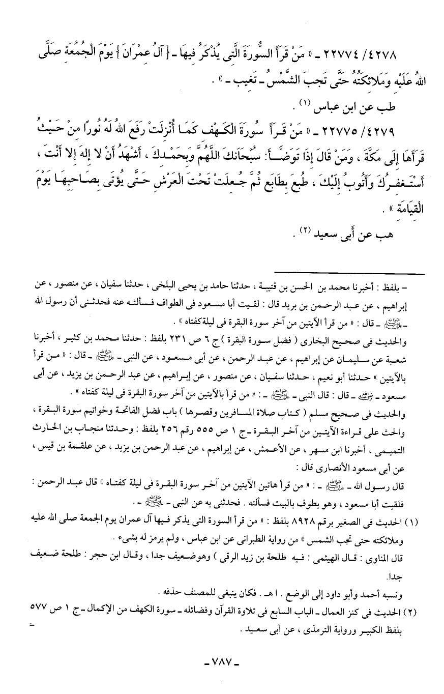 4278/ 22774 - "مَنْ قَرَأَ السُّورَةَ الَّتِي يُذْكَرُ فِيهَا-[آلُ عِمْرَانَ] يَوْمَ الْجُمُعَةِ صَلَّى اللهُ عَلَيهِ وَمَلائِكَتُهُ حَتَّى تَجبَ الشَّمْسُ -تَغِيب-".