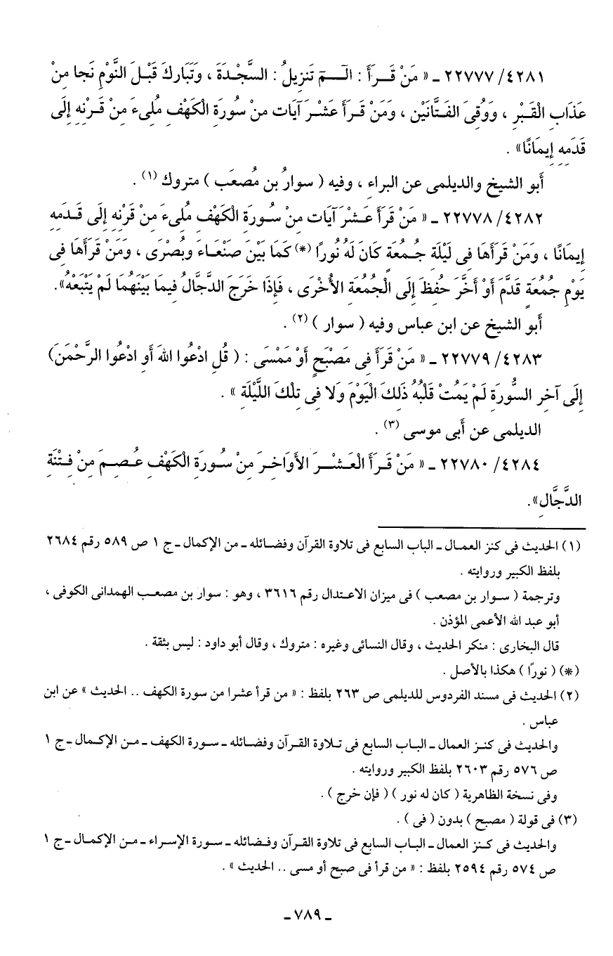 4282/ 22778 - "مَنْ قَرَأَ عَشْرَ آيَات مِنْ سُورَةٍ الكَهْفِ مُلِيءَ مِنْ قَرْنِهِ إِلَى قَدَمِهِ إِيمَانًا، وَمَنْ قَرَأَهَا فِي لَيلَةِ جُمُعَة كَانَ لَهُ نُورًا (*) كمَا بَين صَنْعَاءَ وبُصْرَى، وَمَنْ قَرَأَهَا فِي يَوْم جُمُعَة قَدَّمَ أَوْ أَخَّرَ حُفِظَ إِلَى الجُمُعَةِ الأُخْرَى، فَإذَا خَرَجَ الدَّجَّالُ فِيمَا بَينَهُمَا لَمْ يَتْبَعْهُ".