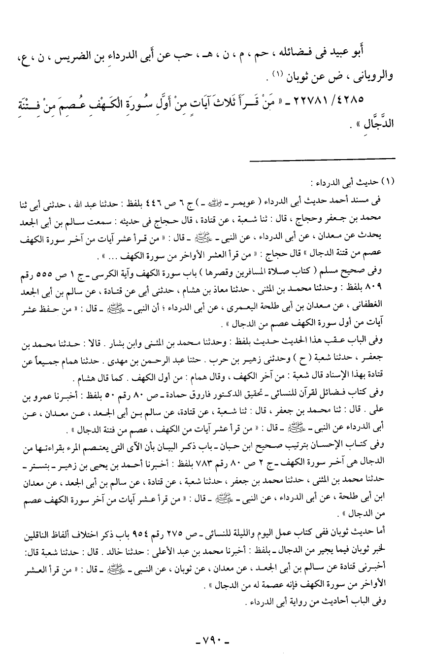 وفي كتاب فضائل القرآن للنسائي- تحقيق الدكتور فاروق حمادة- ص 80 رقم 50 بلفظ: أخبرنا عمرو بن علي. قال: ثنا محمد بن جعفر، قال ثنا شعبة، عن قتادة، عن سالم بن أبي الجعد، عن معدان، عن أبي الدرداء عن النبي - صلى الله عليه وسلم - قال: "من قرأ عشر آيات من الكهف، عصم من فتنة الدجال".
