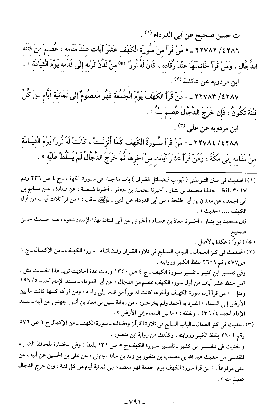 4286/ 22782 - "مَنْ قَرَأَ مِنْ سُورَةِ الكَهْفِ عَشْرَ آيَاتٍ عِنْدَ مَنَامِهِ، عُصِمَ مِنْ فِتْنَةِ الدَّجَّالِ، وَمَنْ قَرَأَ خَاتِمَتَهَا عِنْدَ رُقَادِهِ، كَانَ لَهُ نُورًا (*) مِنْ لَدُنْ قَرْنِهِ إِلَى قَدَمِهِ يَوْمَ القِيَامَةِ".