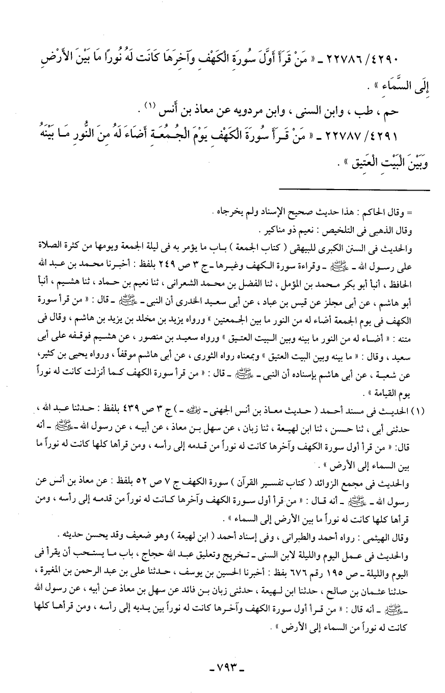 4291/ 22787 - "مَنْ قَرَأَ سُورَةَ الكَهْفِ يَوْمَ الْجُمُعَةِ أَضَاءَ لَهُ مِنَ النُّورِ مَا بَينَهُ وَبَينَ البَيتِ العَتِيق".