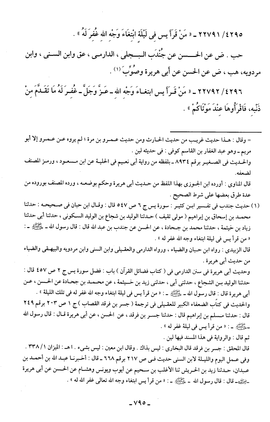 4295/ 22791 - "مَنْ قَرَأَ يس فِي لَيلَةٍ ابْتِغَاءَ وَجْهِ اللهِ غُفِرَ لَهُ".