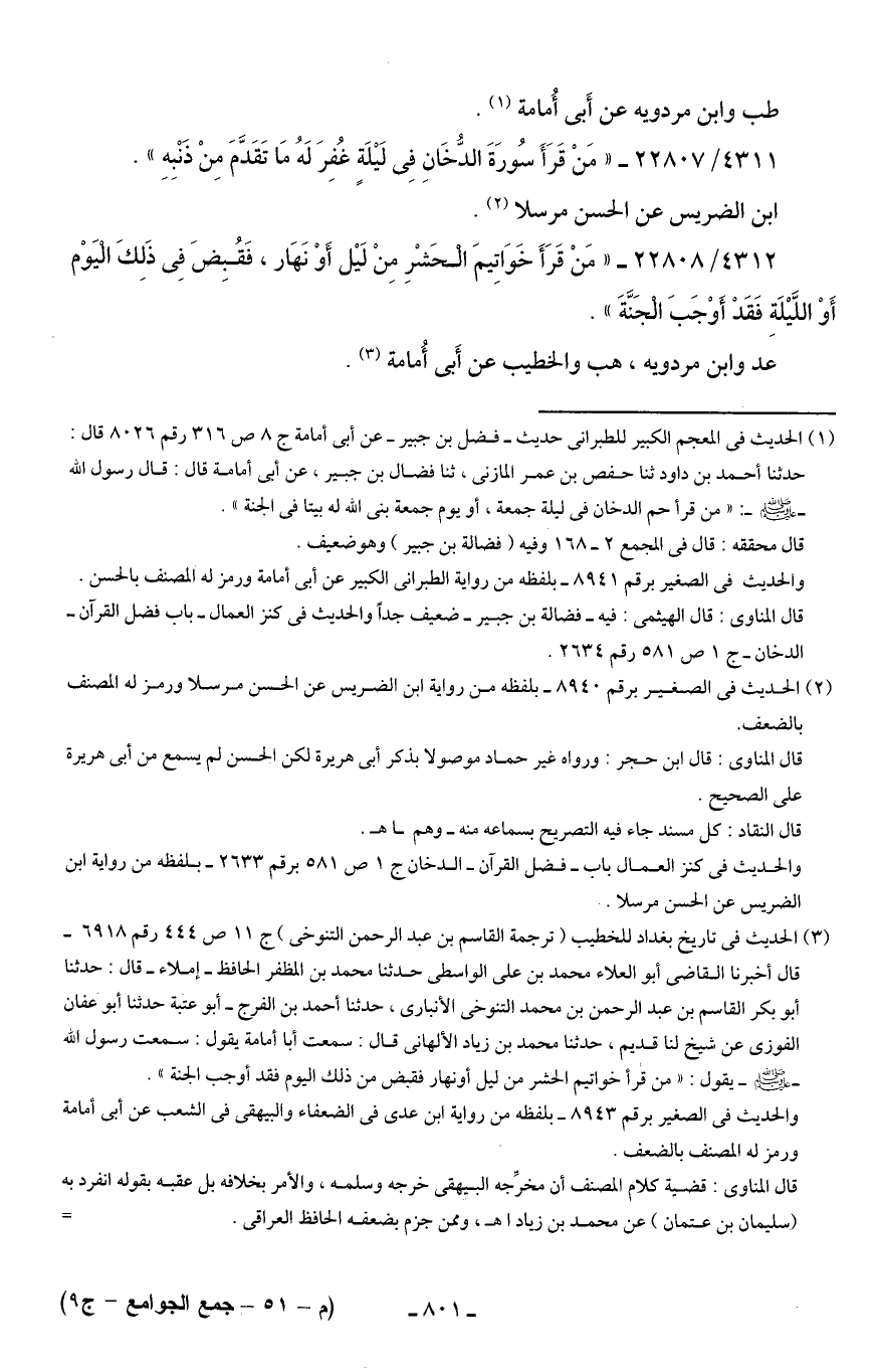 (¬1) الحديث في المعجم الكبير للطبراني حديث -فضل بن جبير- عن أبي أمامة ج 8 ص 316 رقم 8026 قال: حدثنا أحمد بن داود ثنا حفص بن عمر المازني، ثنا فضال بن جبير، عن أبي أمامة قال: قال رسول الله - صلى الله عليه وسلم -: "من قرأ حم الدخان في ليلة جمعة، أو يوم جمعة بنى الله له بيتا في الجنة".