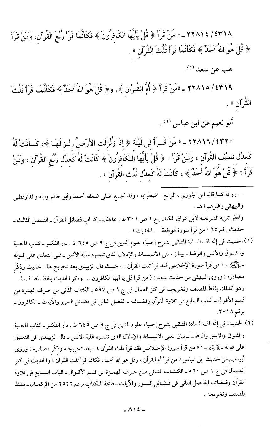 (¬2) الحديث في إتحاف السادة المتقين بشرح إحياء علوم الدين في ج 9 ص 645 ط. دار الفكر -كتاب المحبة والشوق والأنس والرضا- بيان معنى الانبساط والإدلال الذي تثمره غلبة الأنس- قال الزبيدي في التعليق على قوله - صلى الله عليه وسلم -: "من قرأ سورة الإخلاص فقد قرأ ثلث القرآن"، بعد تخريجه وذِكرِ مصادره: وروى أبو نعيم من حديث ابن عباس "من قرأ أم القرآن، وقل هو الله أحد، فكأنما قرأ ثلث القرآن" والحديث في كنز العمال في ج 1 ص 560 - الكتاب الثاني من حرف الهمزة من قسم الأقوال- الباب السابع في تلاوة القرآن وفضائله الفصل الثاني في فضائل السور والآيات- فاتحة الكتاب برقم 2522 من الإكمال- بلفظ المصنف وتخريجه.