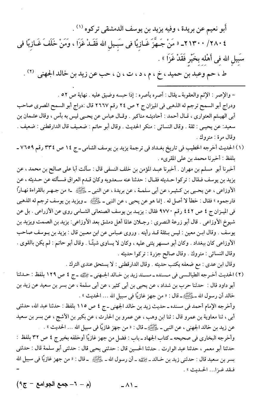 (¬2) الحديث أخرجه الطيالسي في مسنده -مسند زيد بن خالد الجهني - رضي الله عنه - ج 4 ص 129 بلفظ: حدثنا أبو داود قال: حدثنا حرب بن شداد، عن يحيى بن أبي كثير، عن أبي سلمة، عن بسر بن سعيد عن زيد بن خالد أن رسول الله - صلى الله عليه وسلم - قال: "من جهز غازيًا في سبيل الله ... الحديث".