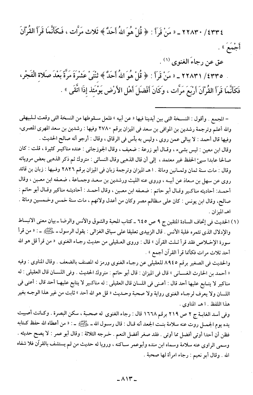 (¬1) الحديث في إتحاف السادة المتقين ج 9 ص 645 - كتاب المحبة والشوق والأنس والرضا- بيان معنى الانبساط والإدلال الذي تثمره غلبة الأنس. قال الزبيدي تعليقا على سياق الغزالى: يقول الرسول - صلى الله عليه وسلم -: "من قرأ سورة الإخلاص فقد قرأ ثلث القرآن" قال: وروى العقيلي من حديث رجاء الغنوى" من قرأ قل هو الله أحد ثلاث مرات فكأنما قرأ القرآن أجمع".