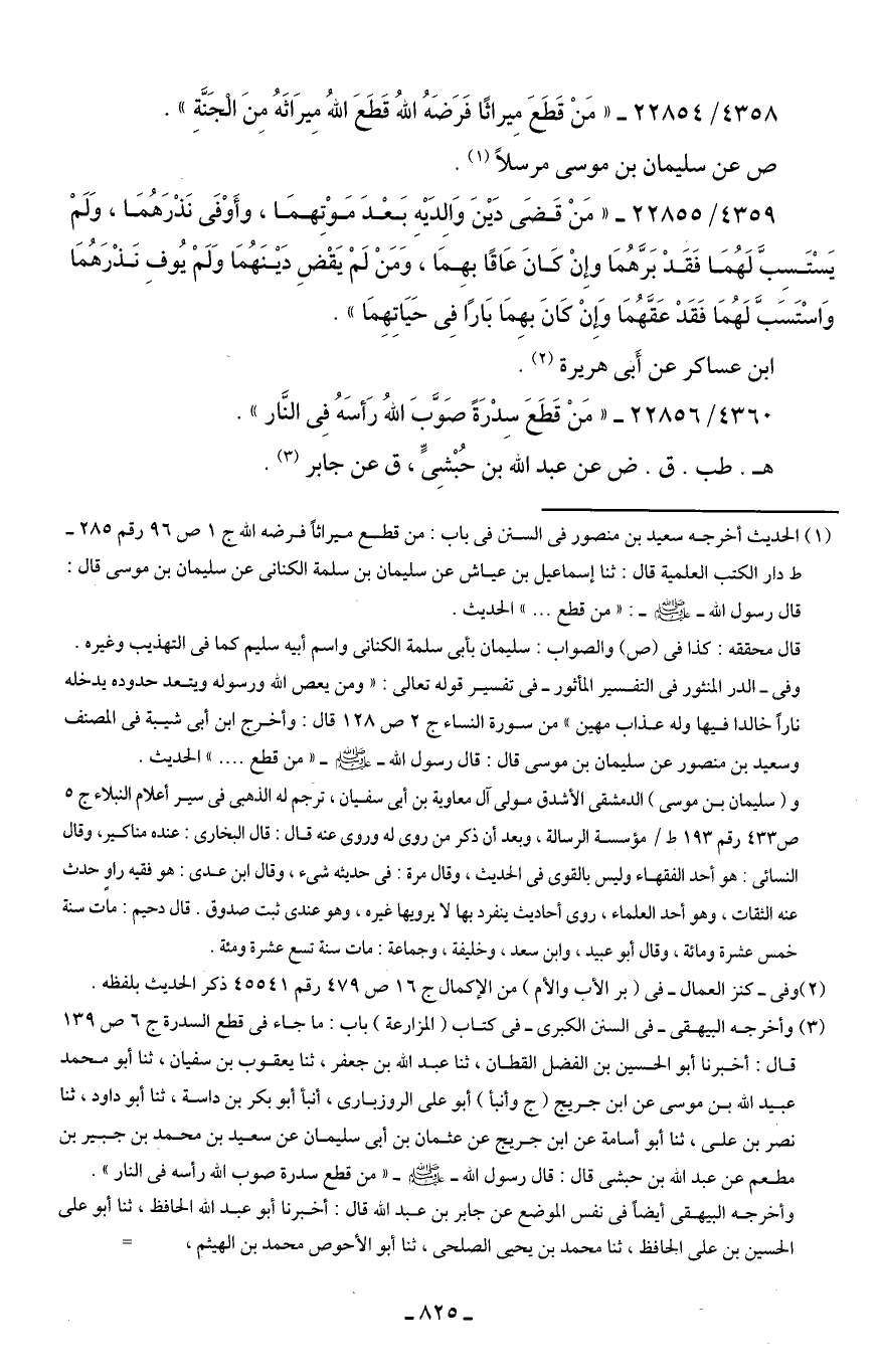 وفي -الدر المنثور في التفسير المأثور- في تفسير قوله تعالى: {وَمَنْ يَعْصِ اللَّهَ وَرَسُولَهُ وَيَتَعَدَّ حُدُودَهُ يُدْخِلْهُ نَارًا خَالِدًا فِيهَا وَلَهُ عَذَابٌ مُهِينٌ} من سورة النساءج 2 ص 128 قال: وأخرج ابن أبي شيبة في المصنف وسعيد بن منصور عن سليمان بن موسى قال: قال رسول الله - صلى الله عليه وسلم - "من قطع. " الحديث.