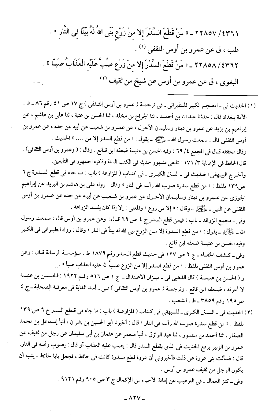 4361/ 22857 - "مَنْ قَطَعَ السِّدْرَ إِلا مِنْ زَرْعٍ بَنَى اللهُ لَهُ بَيتًا فِي النَّارِ".