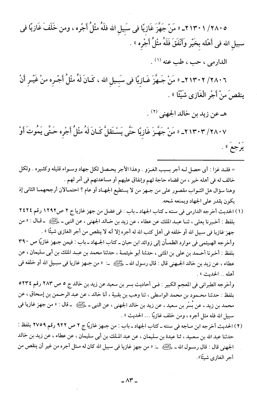 2806/ 21302 - "مَنْ جَهَّزَ غَازِيًا في سَبِيلِ الله، كَانَ لَهُ مثْلُ أَجْرِه منْ غَيرِ أَنْ ينقصَ منْ أَجْر الْغَازى شَيئًا".