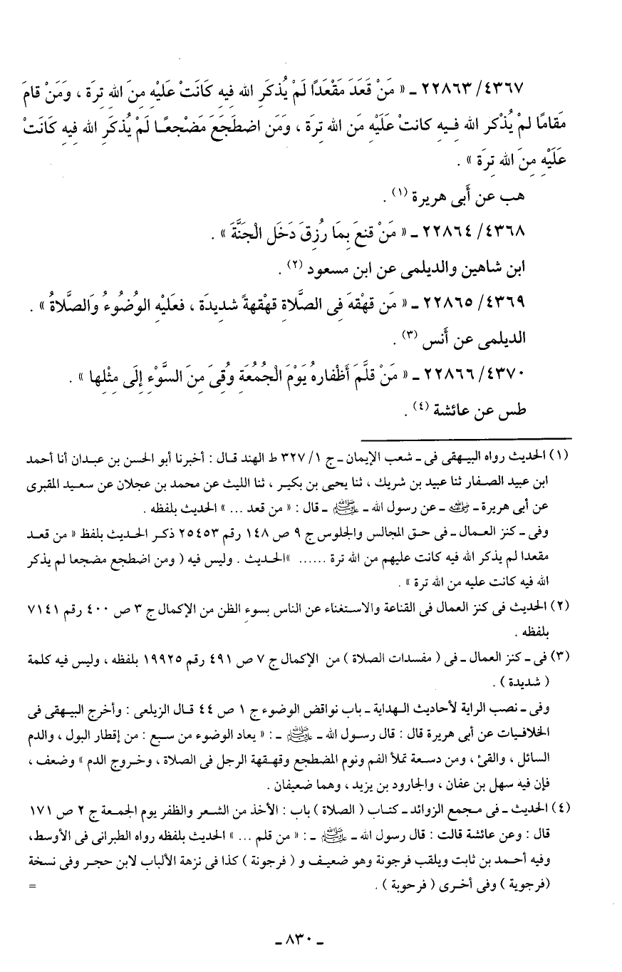 4367/ 22863 - "مَنْ قَعَدَ مَقْعَدًا لَمْ يُذكَرِ الله فِيهِ كَانَتْ عَليهِ مِنَ اللهِ تِرَة، وَمَنْ قامَ مَقامًا لمْ يُذْكر الله فِيهِ كانتْ عَلَيهِ مَن الله تِرَة، وَمَن اضطَجَعَ مَضْجعًا لَمْ يُذكَرِ الله فِيهِ كَانَتْ عَلَيهِ مِنَ الله تِرَة".