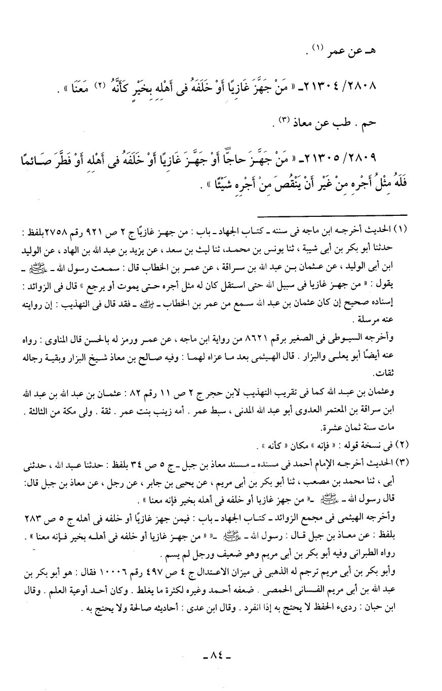(¬3) الحديث أخرجه الإمام أحمد في مسنده -مسند معاذ بن جبل- ج 5 ص 34 بلفظ: حدثنا عبد الله، حدثني أبي، ثنا محمد بن مصعب، ثنا أبو بكر بن أبي مريم، عن يحيى بن جابر، عن رجل، عن معاذ بن جبل قال: قال رسول الله - صلى الله عليه وسلم - "من جهز غازيا أو خلفه في أهله بخير فإنه معنا".