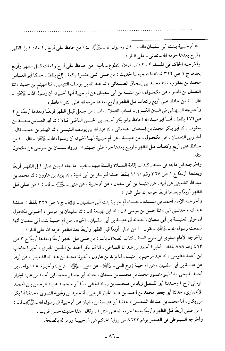 = أم حبيبة بنت أبي سفيان قالت: قال رسول الله - صلى الله عليه وسلم -: "من حافظ على أربع ركعات قبل الظهر وأربع بعدها حرمه الله -تعالى- على النار".